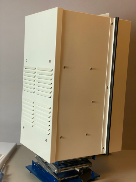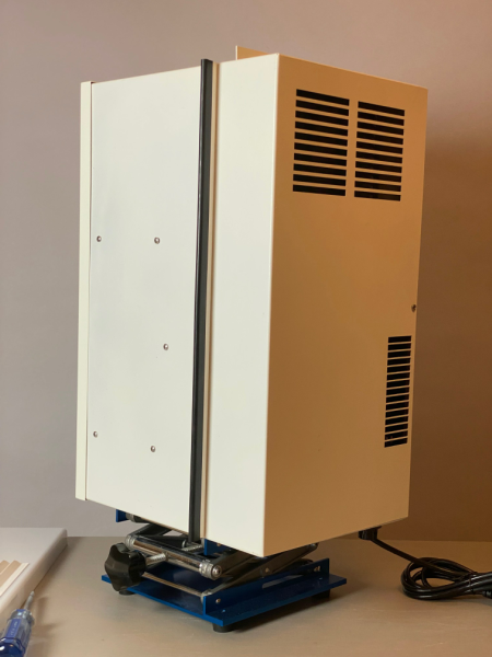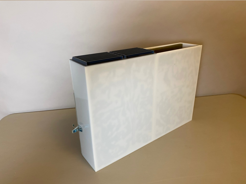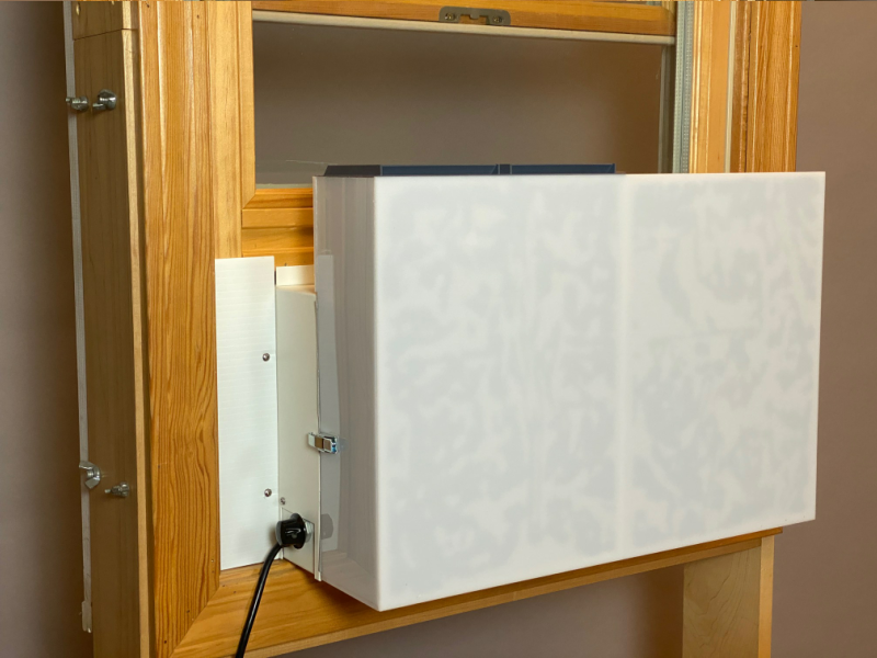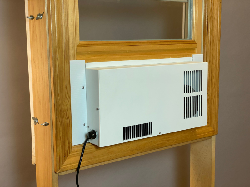 For sliding windows, the ERV is best rotated 90°, so the window only has to be opened 9 inches instead of 18 inches. In this orientation, the rain louvers are not properly oriented, so, at no extra charge, we will supply an exterior cover with the louvers modified, as shown above. The open gap above the ERV, 9 inches wide by the height of the window minus 18 inches, can be filled with plywood or transparent polycarbonate. There are online suppliers that will cut polycarbonate sheet to order and ship the product to you.