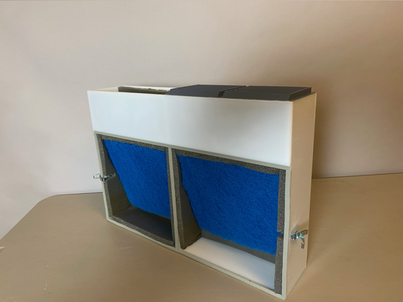The muffler attaches to the ERV with two load rated latches on either side, without having to remove the ERV from the window. The muffler reduces noise by 9 dB! The blue dust filters are merv 6 and are washable. Optional merv 8 filter material is available, but it is not washable. It must be replaced when dirty.